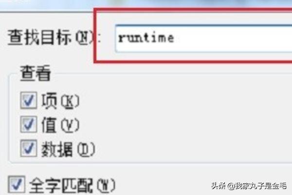 5、在查找目标中输入“runtime”,选择“全字匹配”,如下图所示: