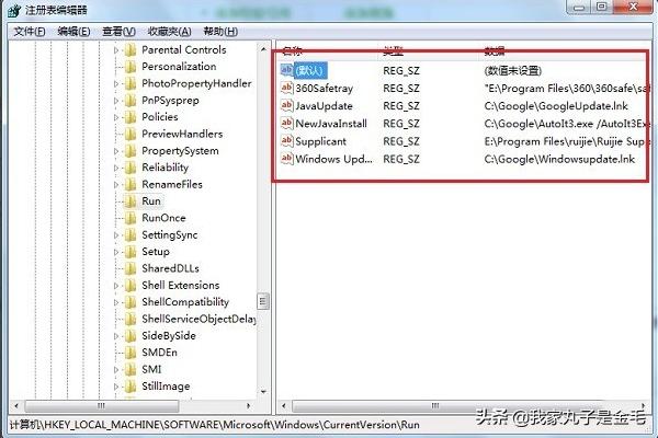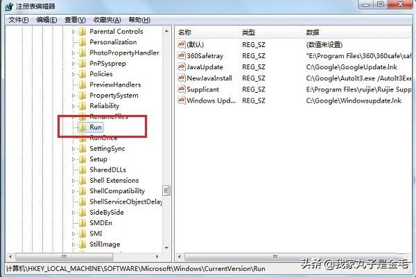 2、点击确定,进去注册表之后,找到“HKEY_LOCAL_MACHINE/SOFTWARE/microsoft/Windows/CurrentVersion/Run”,如下图所示: