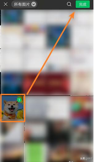 6. 在弹出的页面中,选择一张图片,点击【完成】,返回到拼图界面中,其他八张图片按照第一张图片插入的操作流程进行。如图
