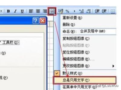 3、在我们选择“自定义”之后,就会发现弹出一个窗口,但是这个窗口对我们来说,不需要做任何的点击。然后我们找到工具栏,在居中并对其图标上单击鼠标右键,将会弹出下拉菜单,然后选择“总是文字”,如图所示: