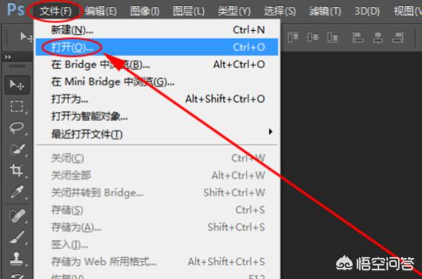 1、打开PS并点击左上角的“文件”,之后再点击“打开”(也可以按下快捷键“Ctrl+O”),打开文件选择窗口。