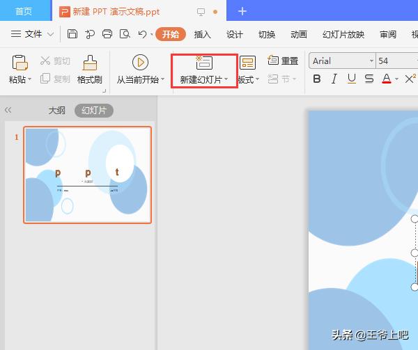 3、主页制作完成后,点击左上角的【开始】会看到【新建幻灯片】选项,然后点击它进行下一页的制作。