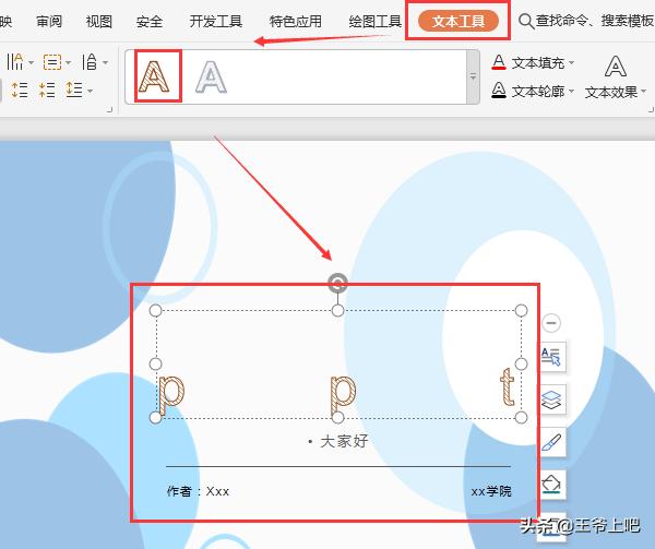 2、点击顶部的【文本工具】下拉菜单选择自己喜欢的艺术字,插入艺术字填写在文本框中。