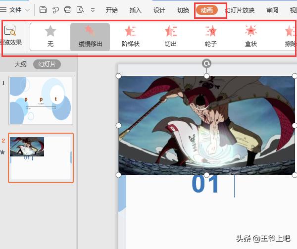 5、可以选择图片的切换方式,选择顶部的【动画】,然后在预览效果中会看到很多动画选项,然后在栏目里点击喜欢的动画选项即可。