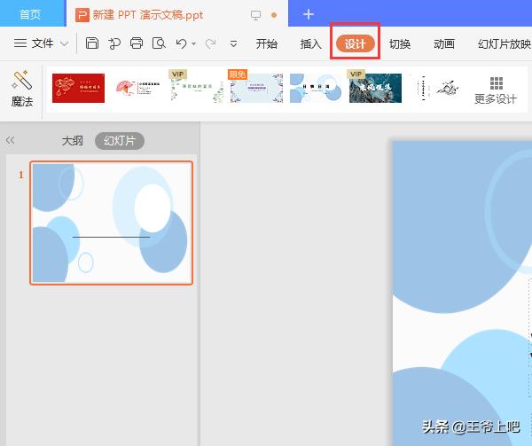 1、新建一个PPT打开开始第一张PPT,点击顶部的“设计”,里面有母版可供我们使用。选择喜欢的模板。